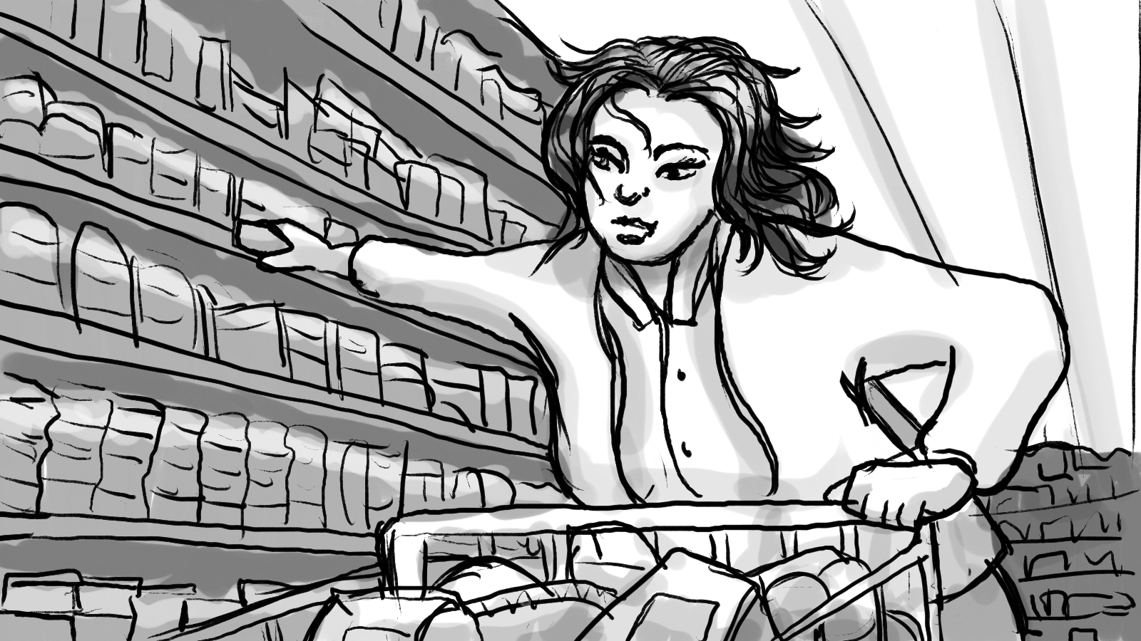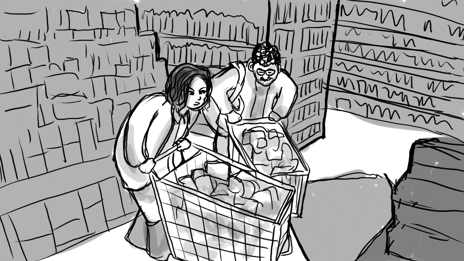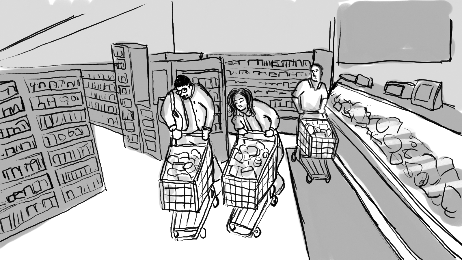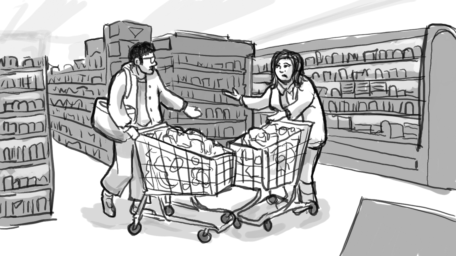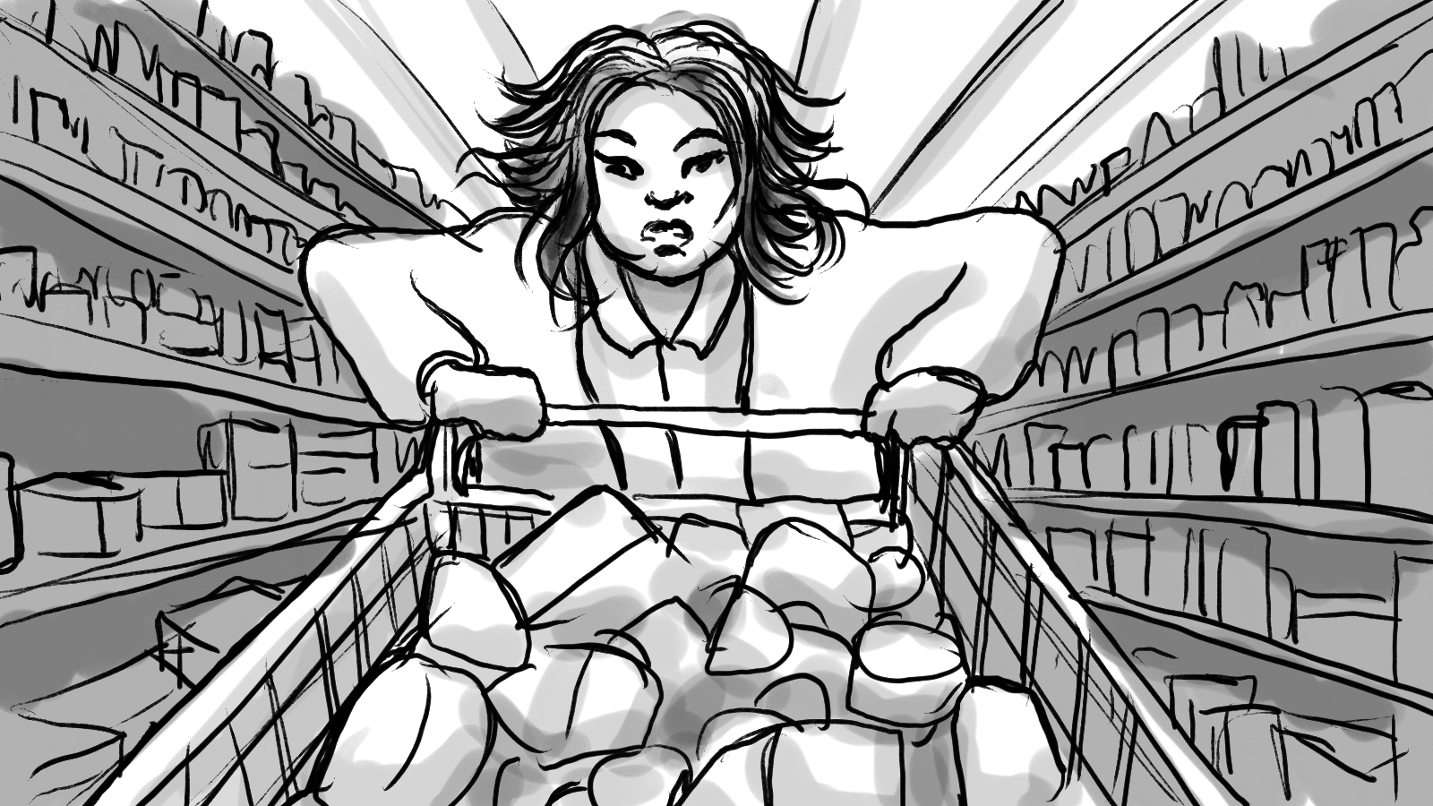 A storyboard for a :60 commercial depicting two shoppers racing through a store to get to the checkout first.