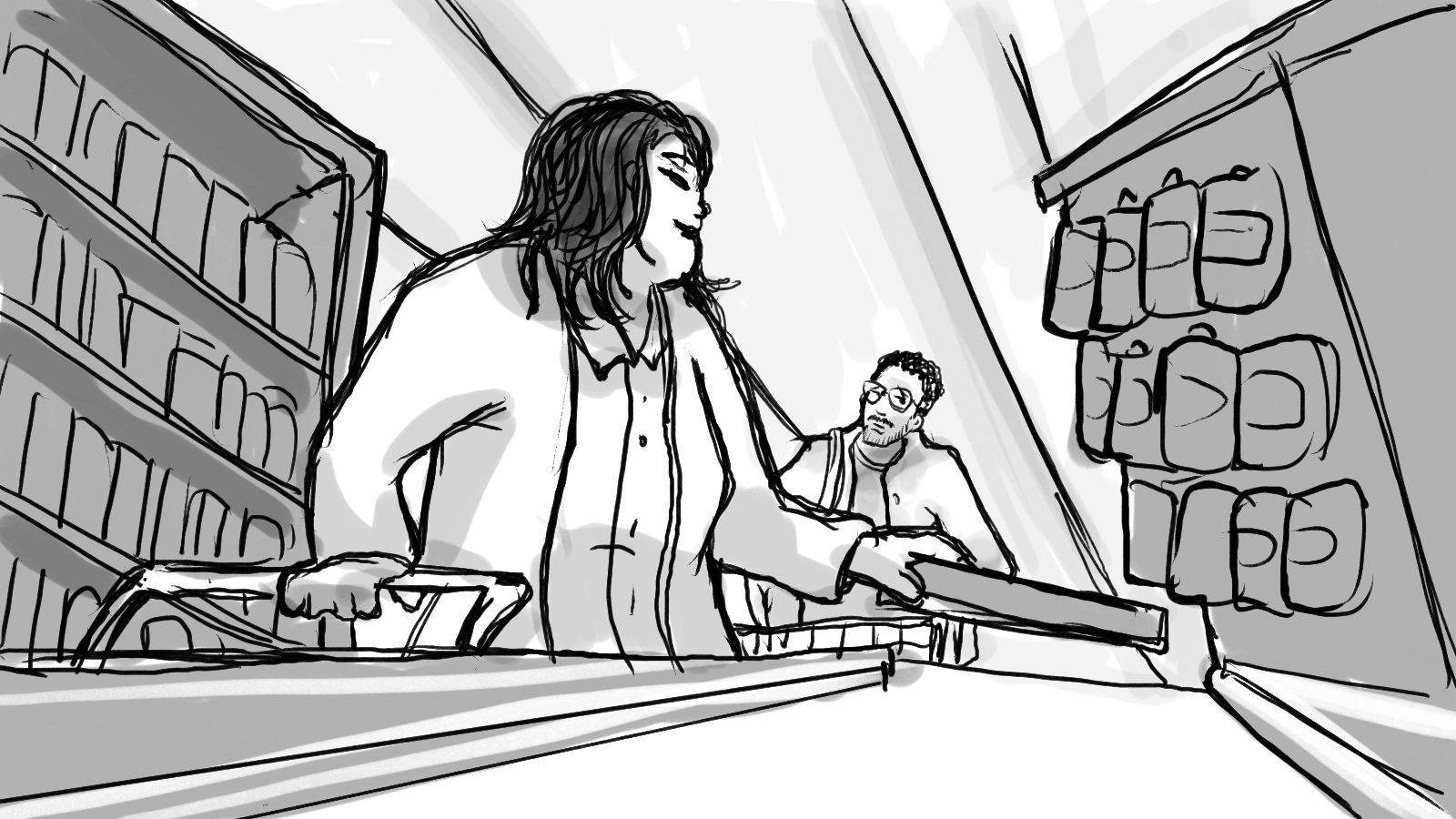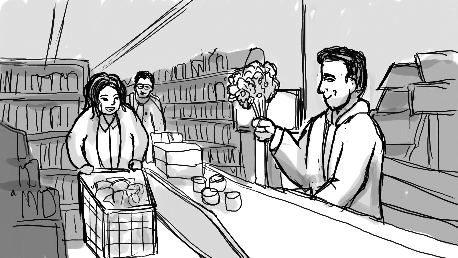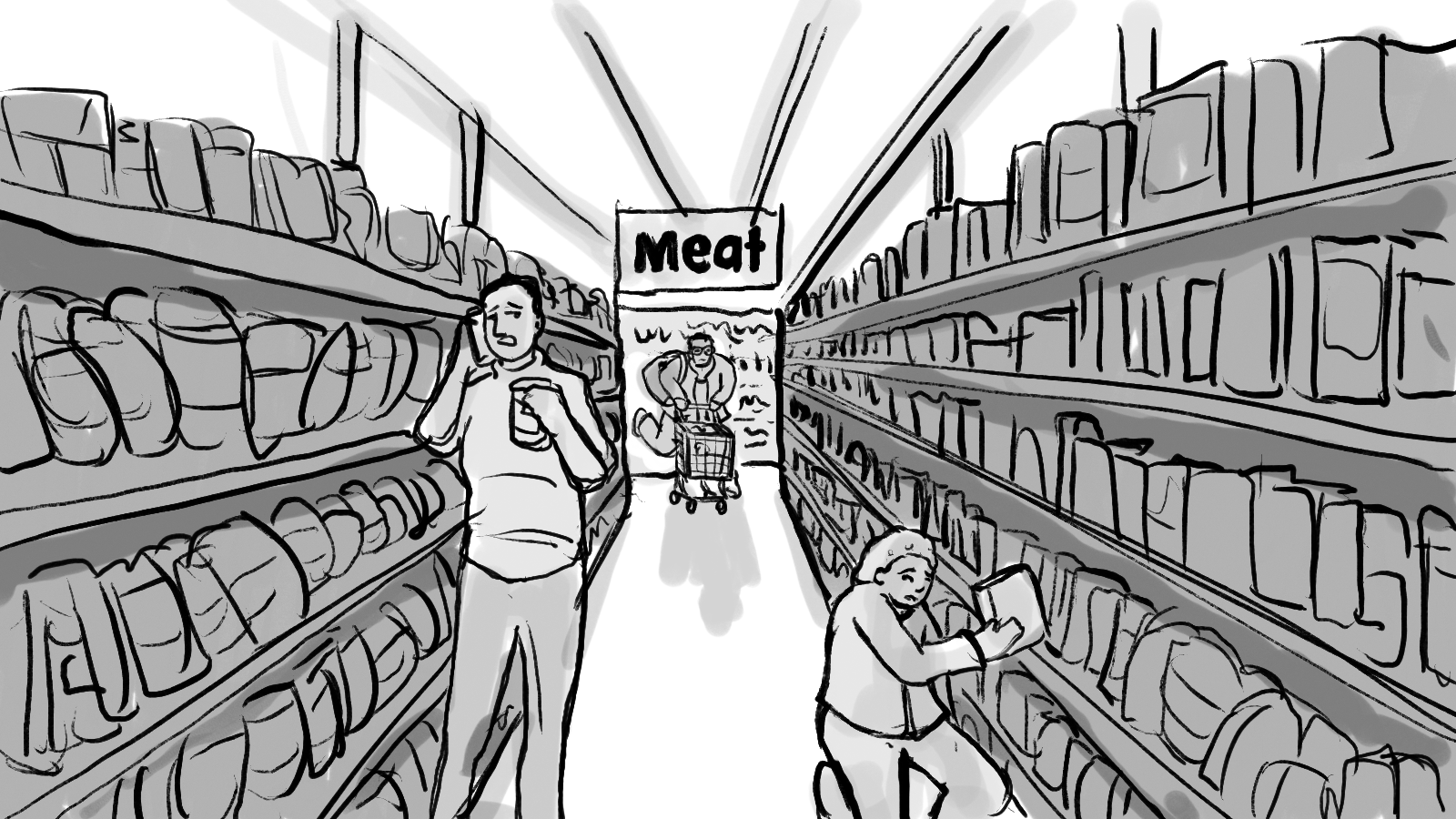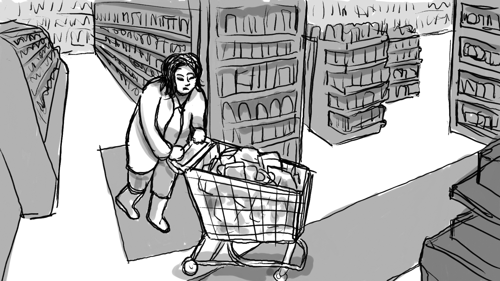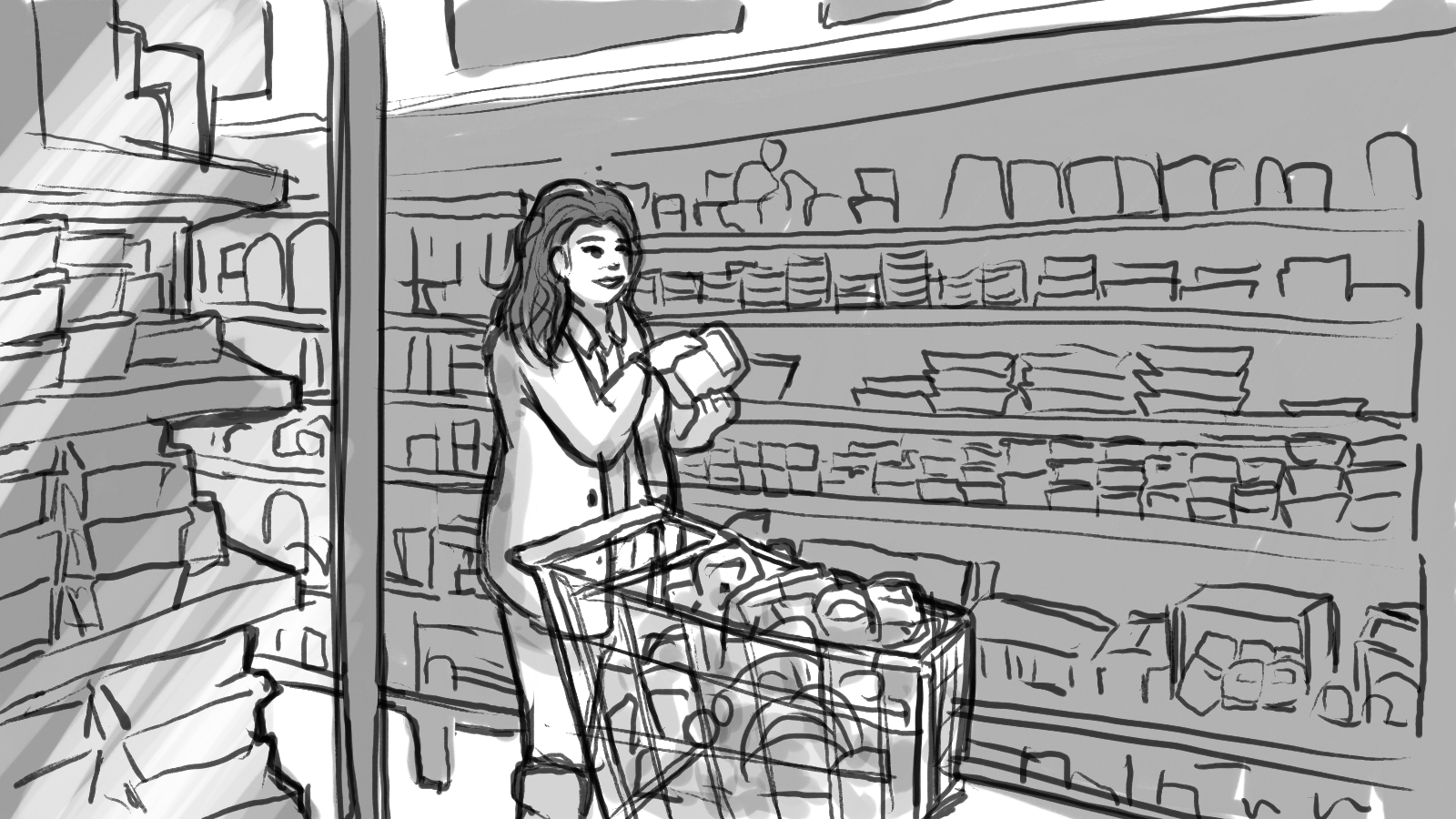 A storyboard for a :60 commercial depicting two shoppers racing through a store to get to the checkout first.