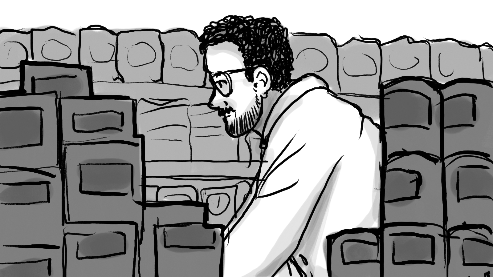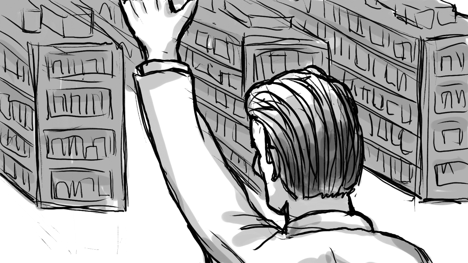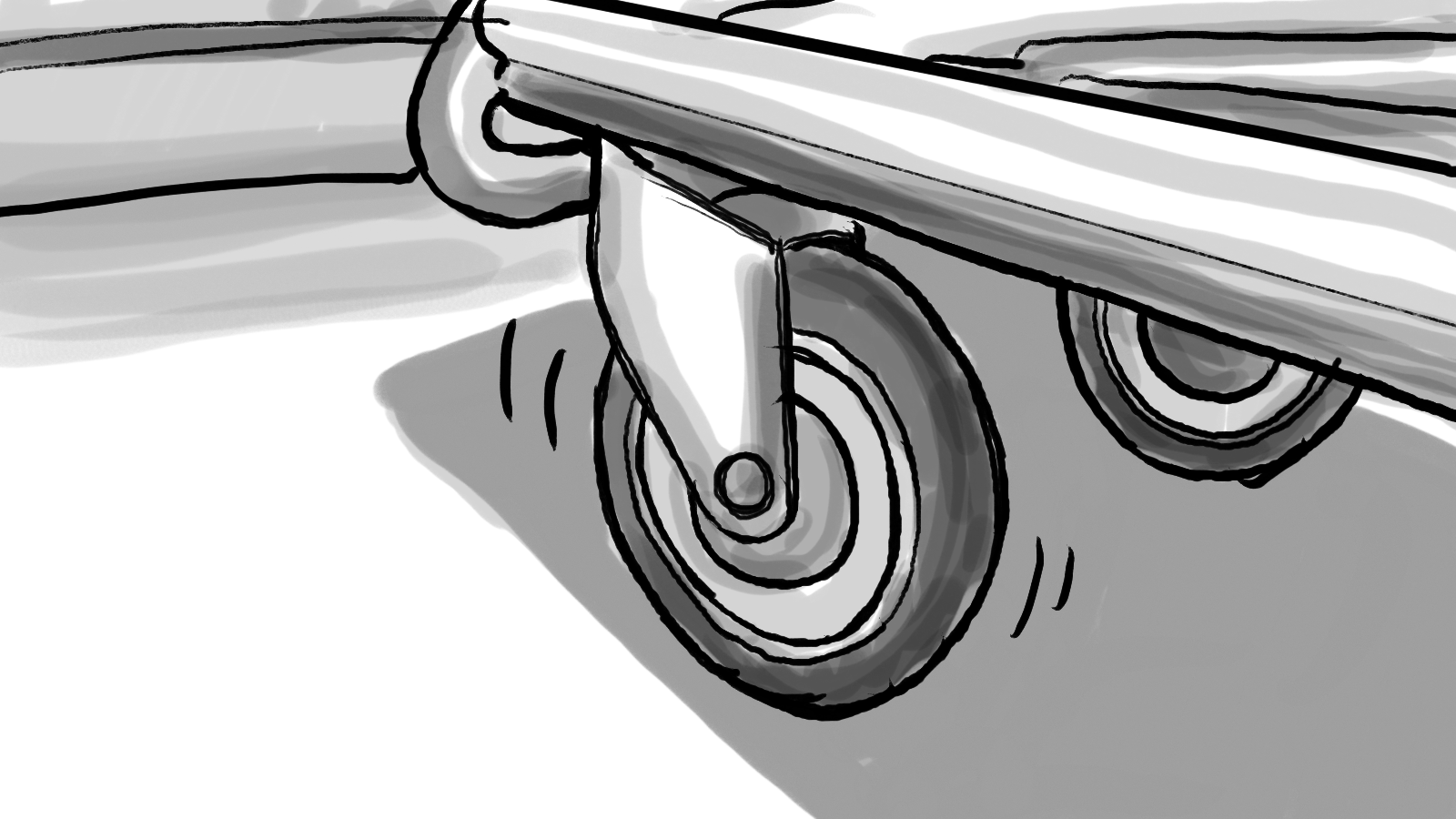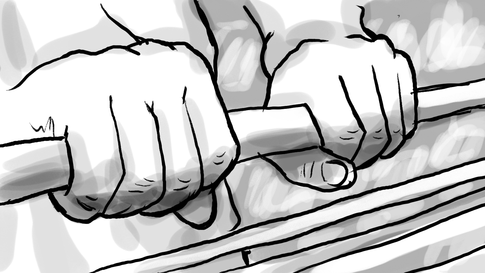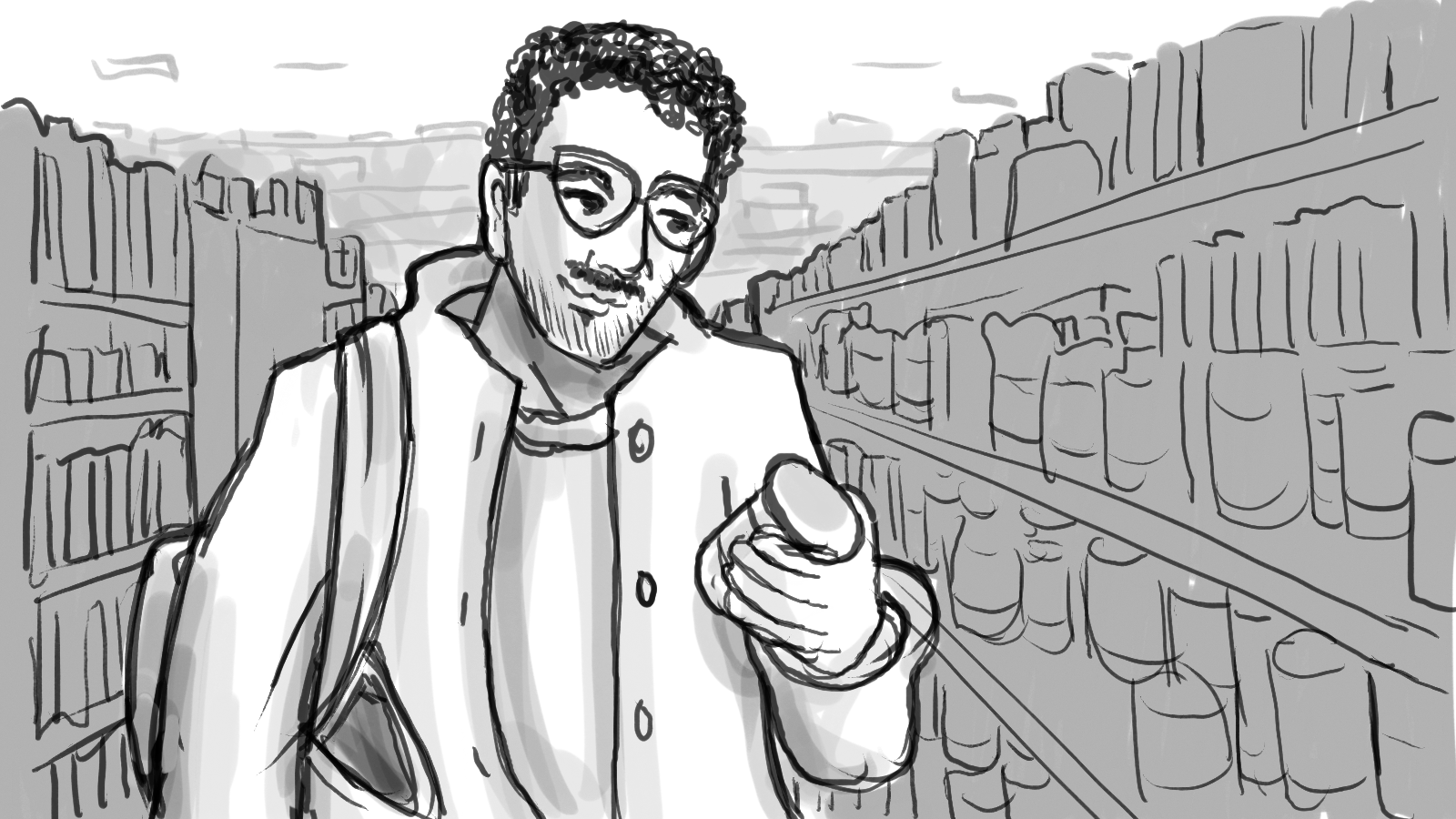 A storyboard for a :60 commercial depicting two shoppers racing through a store to get to the checkout first.